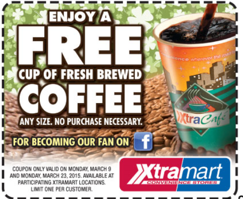 Head Here to print a coupon redeemable at Xtra Mart for a FREE Any Size Cup Of Fresh Brewed Coffee! No purchase Necessary valid today 3/9 only! Go here to find a location near you!
